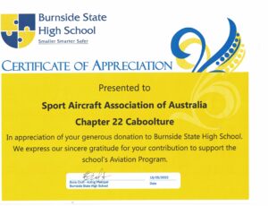 Burnside State High School is one of three local schools being assisted by the local Chapter of the Sport Aircraft Association of Australia in aircraft builds and there to witness the hand-over and assist were the schools’ SAAA mentors, John Butler, Graeme Lean, TC Bob Veale and Sunshine Coast Chapter 22 President Chris Wilson. Burnside was of course one of the schools who participated in the SAAA RV12 build recently.